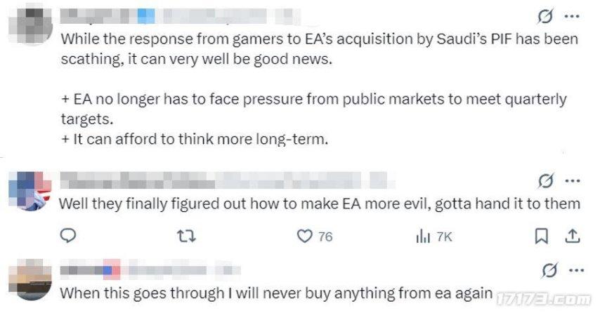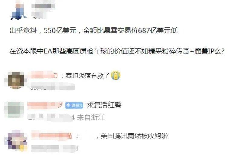 對於EA賣身的操作,有網友感覺550億美元賣虧了,因爲當年微軟買暴雪可是花了687億美元。還有不少求復活遊戲的網友,如《泰坦隕落》《紅色警戒》等遊戲。也有震驚網友吐槽,美國騰訊竟然被收購了!