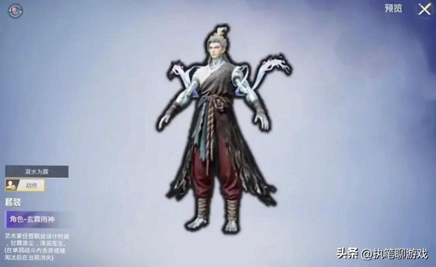 然後再來看玄霖雨神,這個角色屬於紫色等級,雖然是男角色,但卻出現了“飄帶”裝飾,整體看起來還算是中規中矩吧~專屬動作被光子命名爲“凝水爲霖”。
