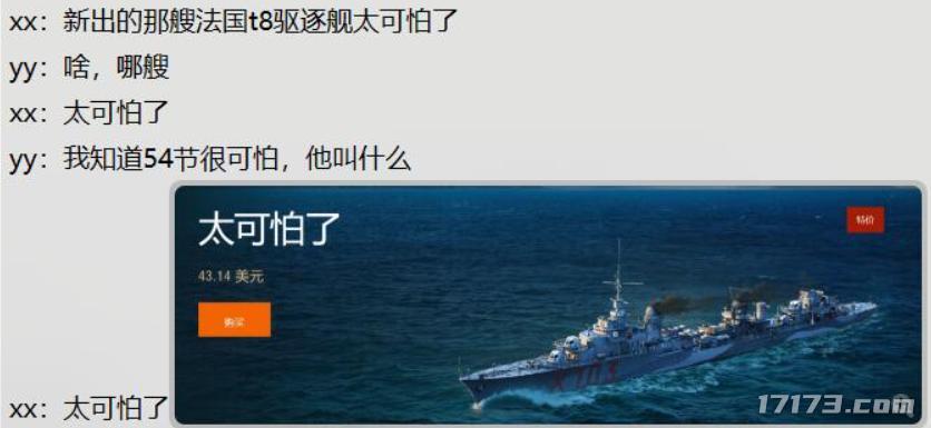 於是乎,這個離大譜的譯名迅速在玩家社區走紅,誕生出了大量諸如“新上線的法國驅逐艦太可怕了!它是很可怕但叫什麼名字?太可怕了!”這樣的諧音梗。