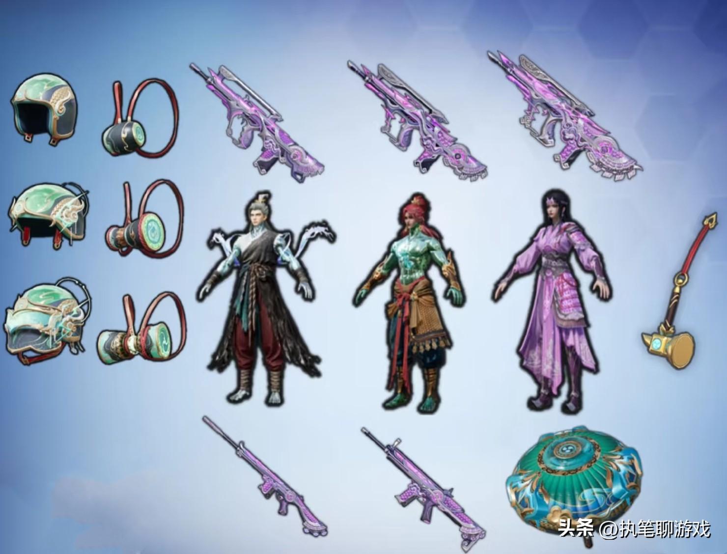 三個角色分別是震天雷神、紫霄電母、玄霖雨神,升級槍是7級Famas,普通皮膚是SLR、ScarL。