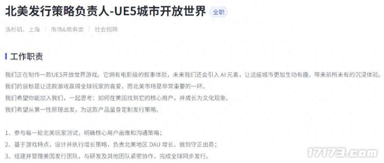 近日,米哈遊官網發佈了關於“北美髮行策略負責人-UE5 城市開放世界”招聘信息,透露正在製作一款虛幻5引擎開發的開放世界遊戲。