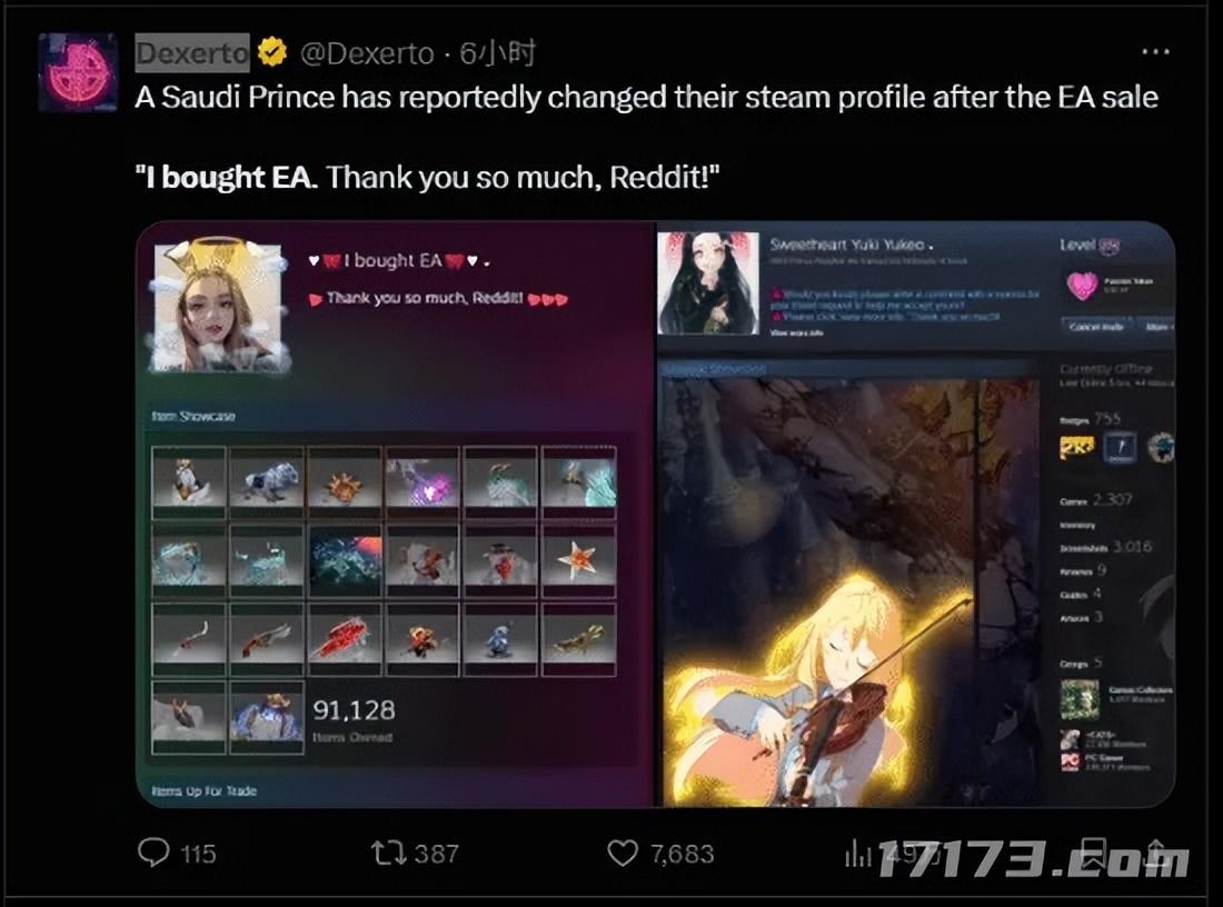 就在這項交易公佈之後,一位沙特王子將自己的Steam暱稱改成了“I bought EA”,即我買下了EA。