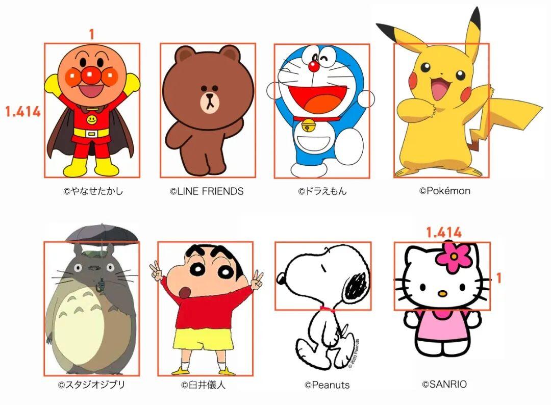 相比修長的黃金比例,運用在角色設計上更容易實現可愛、輕鬆和穩定的效果。比如像日本那邊的設計參考書,經常拿哆啦A夢、HelloKitty、蠟筆小新之類卡通角色來舉例。