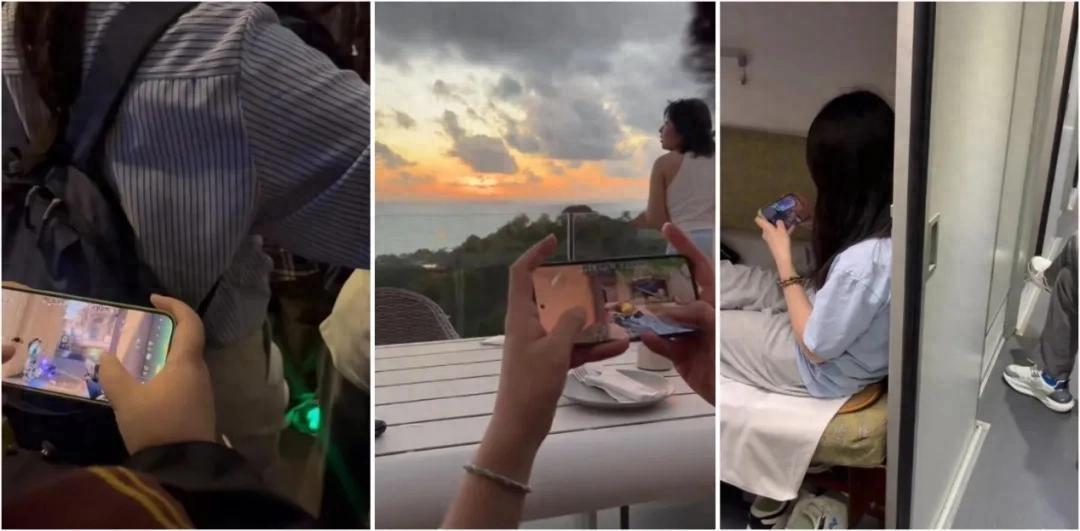但接下來幾天我發現事情不簡單,飯點爆滿的餐廳中、小憩觀景的咖啡店內、前往各大省市的火車上、景區運營的觀光車/索道里、等待女友換裝的妝造店前……但凡能稍微停下來休息會兒的地方,都能發現“打瓦手”的身影。