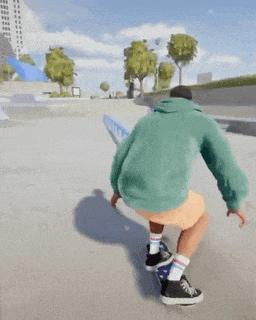 沒有滑板品牌的露出,沒有邊緣人的刻畫,也沒有反主流文化的要素。只有類似《模擬人生》《堡壘之夜》風格的卡通人物穿梭在鮮豔明媚的街道。