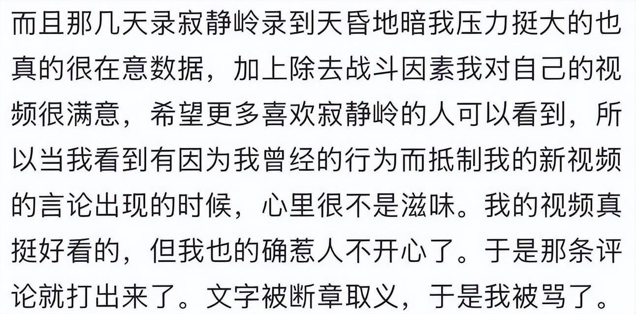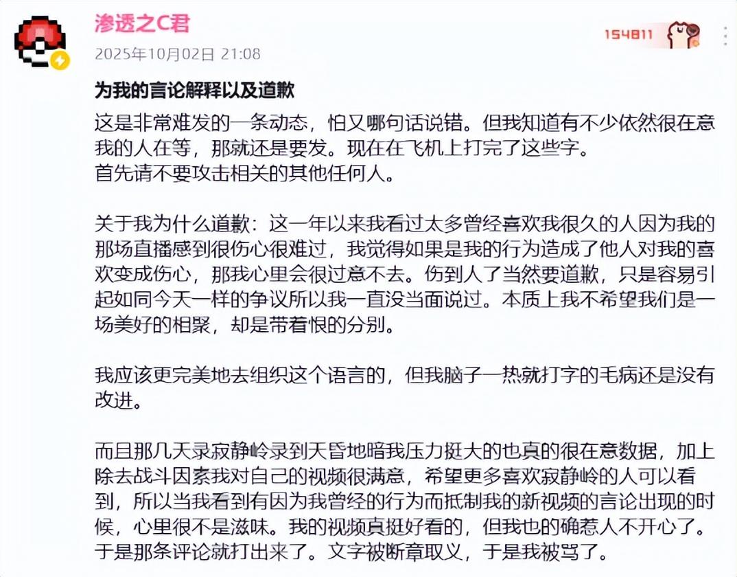 面對如潮水般湧來的質疑,C菌很快在B站發佈了一篇長文解釋,說自己看到有人因他直播過黑神話而抵制新視頻,“心裏很不是滋味”。