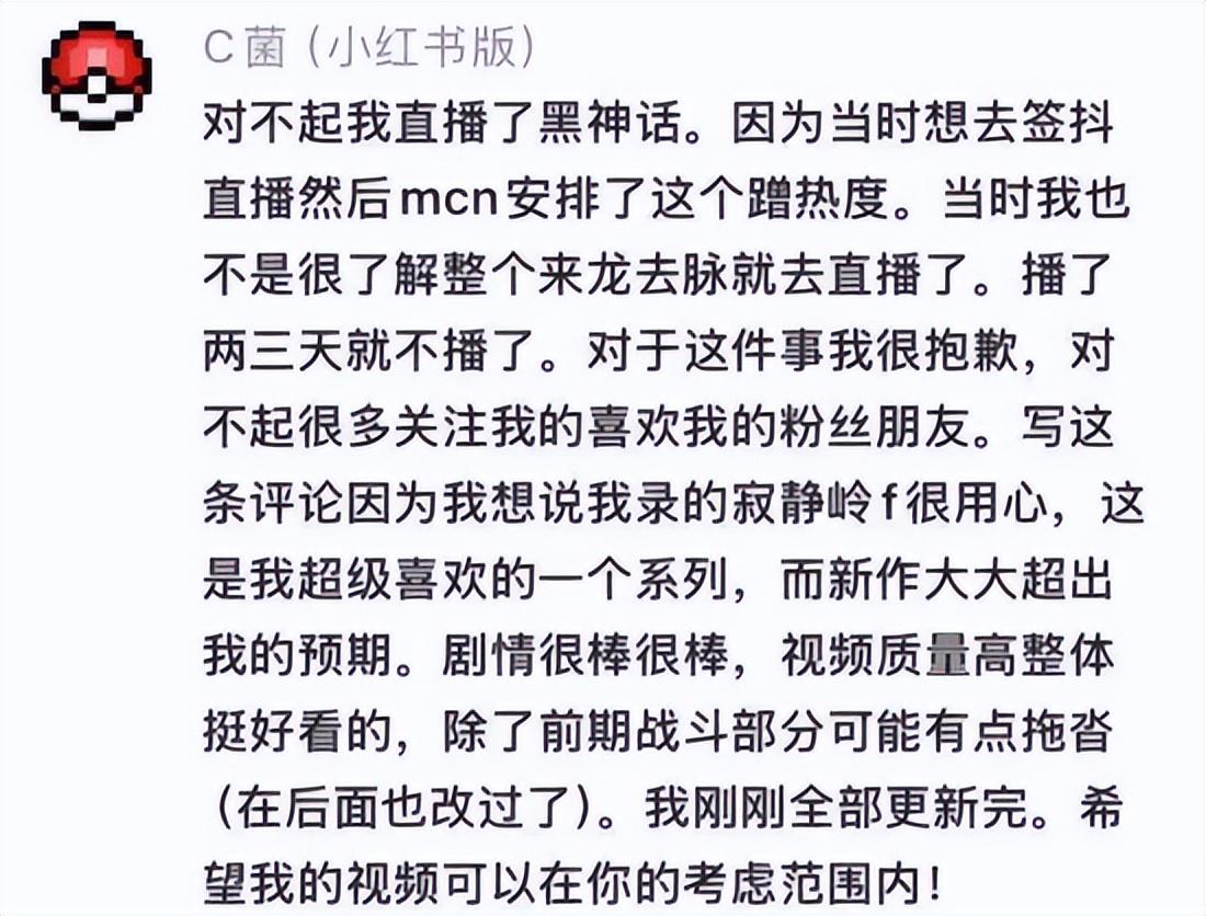 近日,著名遊戲UP主C菌在小紅書安利自己的《寂靜嶺f》實況時,突然話鋒一轉,爲自己曾經直播《黑神話:悟空》的行爲向粉絲致歉。