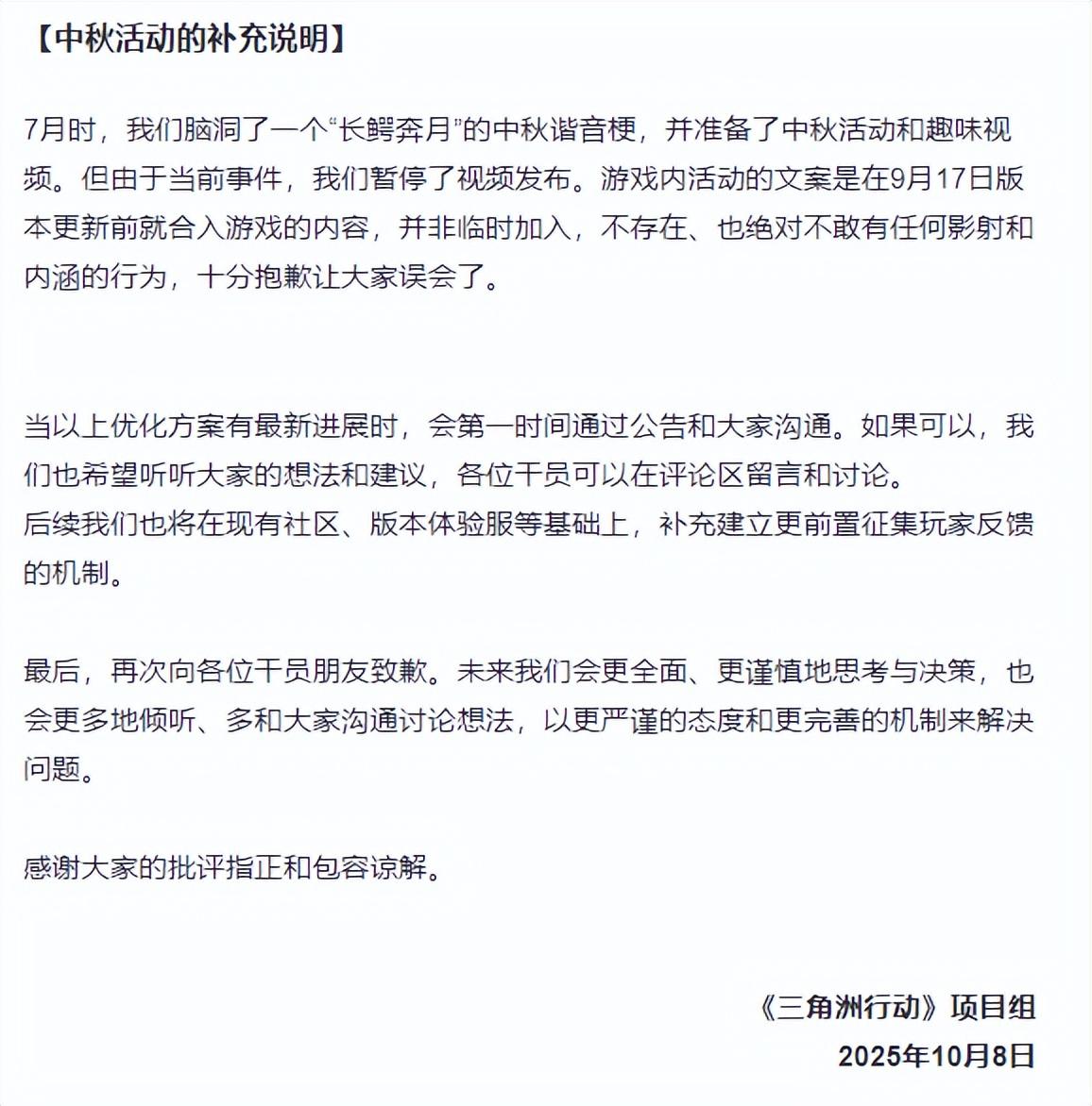 有意思的是,官方還特別提及了一個讓人哭笑不得的誤會。他們原計劃的中秋活動“長鱷奔月”諧音梗,被部分玩家懷疑是“內涵”行爲。