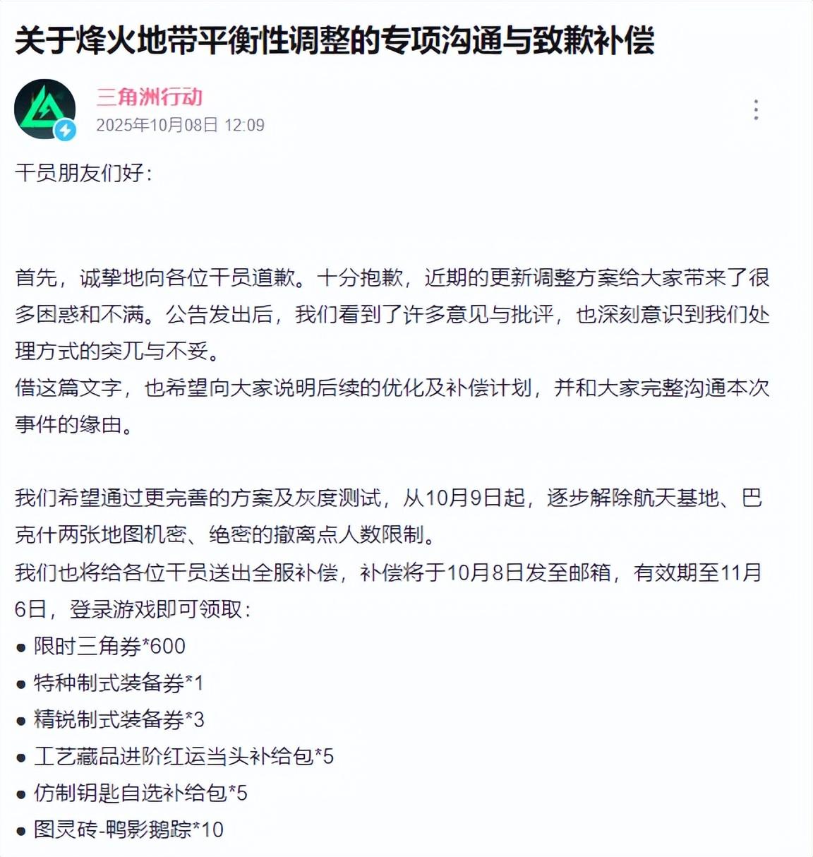 此操作一出,玩家社區直接炸鍋。面對潮水般的批評,官方果斷選擇了滑跪。他們發佈公告,深刻反省了這次更新的“突兀與不妥”,並承諾從10月9日起逐步解除航天基地、巴克什兩張地圖的撤離點人數限制。