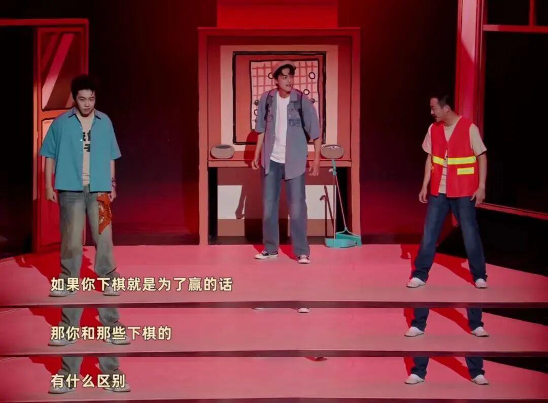 而這場表演中,預期違背的巔峯,莫過於技能五在被張呈斥責“根本不懂五子棋的真諦”時,他頓了幾秒,煞有其事地扔下手中的掃帚,顫抖地轉過身來指着張呈。