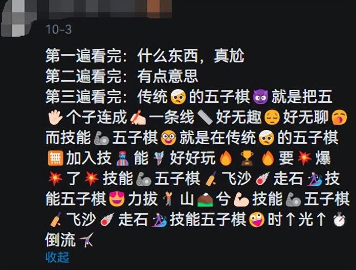 如今,打開任意一個網絡社媒平臺,都會在不經意間遭到“技能五子棋”的追殺……普通網友也好、網紅明星也好,不同領域、不同圈層的人都主動加入了這場莫名其妙的狂歡之中。