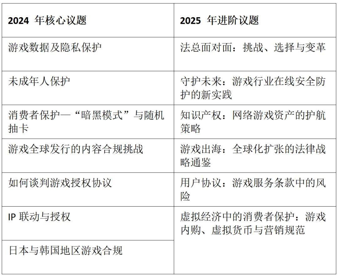 論壇議題圍繞全球遊戲行業法律熱點與痛點展開,呈現出從“風險應對” 到 “戰略佈局” 的進階趨勢,具體內容如下表所示: