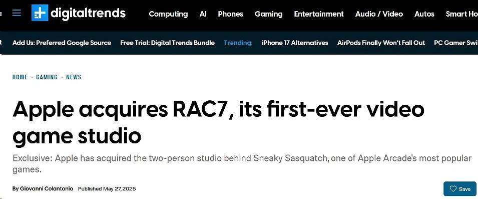 此外,據外媒Digital Trends今年5月的報道,Apple還可能收購了成員僅有2人的遊戲開發團隊RAC7(《Sneaky Sasquatch》的開發團隊,該遊戲曾斬獲2020年Apple Arcade年度遊戲獎項),如果情況屬實,這會是蘋果首次收購遊戲團隊……