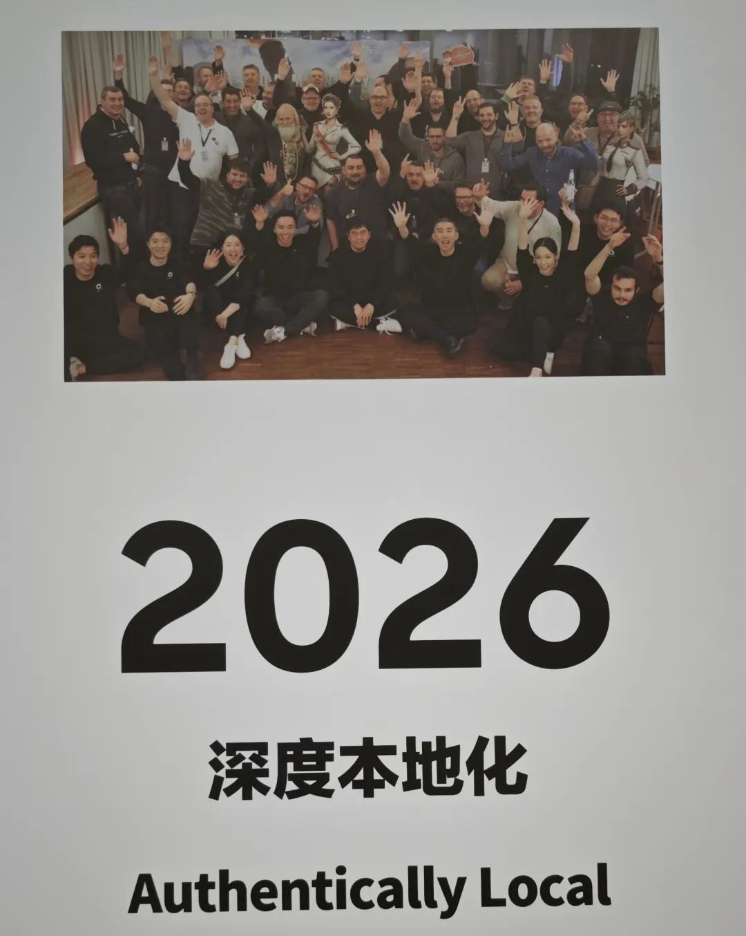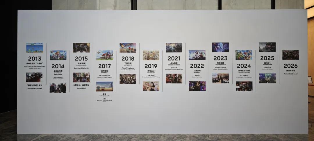 再比如,今天莉莉絲的歷史介紹板上,寫着“2026 深度本地化”的字樣。王信文向庫克介紹說,從2026年開始,莉莉絲會微調全球化戰略——過去公司總是嘗試一款遊戲全球通喫,但後來團隊發現這樣沒法做出極致的產品,所以之後會推出更加「深度本地化」的遊戲。