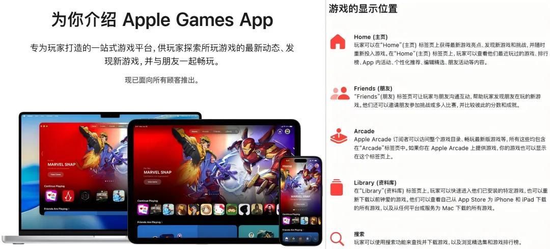 據蘋果官網介紹,Apple Games app不僅囊括原有的Game Center功能,還增加了成就、社交、資料庫等系統。比如用戶可以在庫中查看已下載的遊戲何先前玩過的遊戲;還可以邀請朋友參加挑戰或多人比賽……