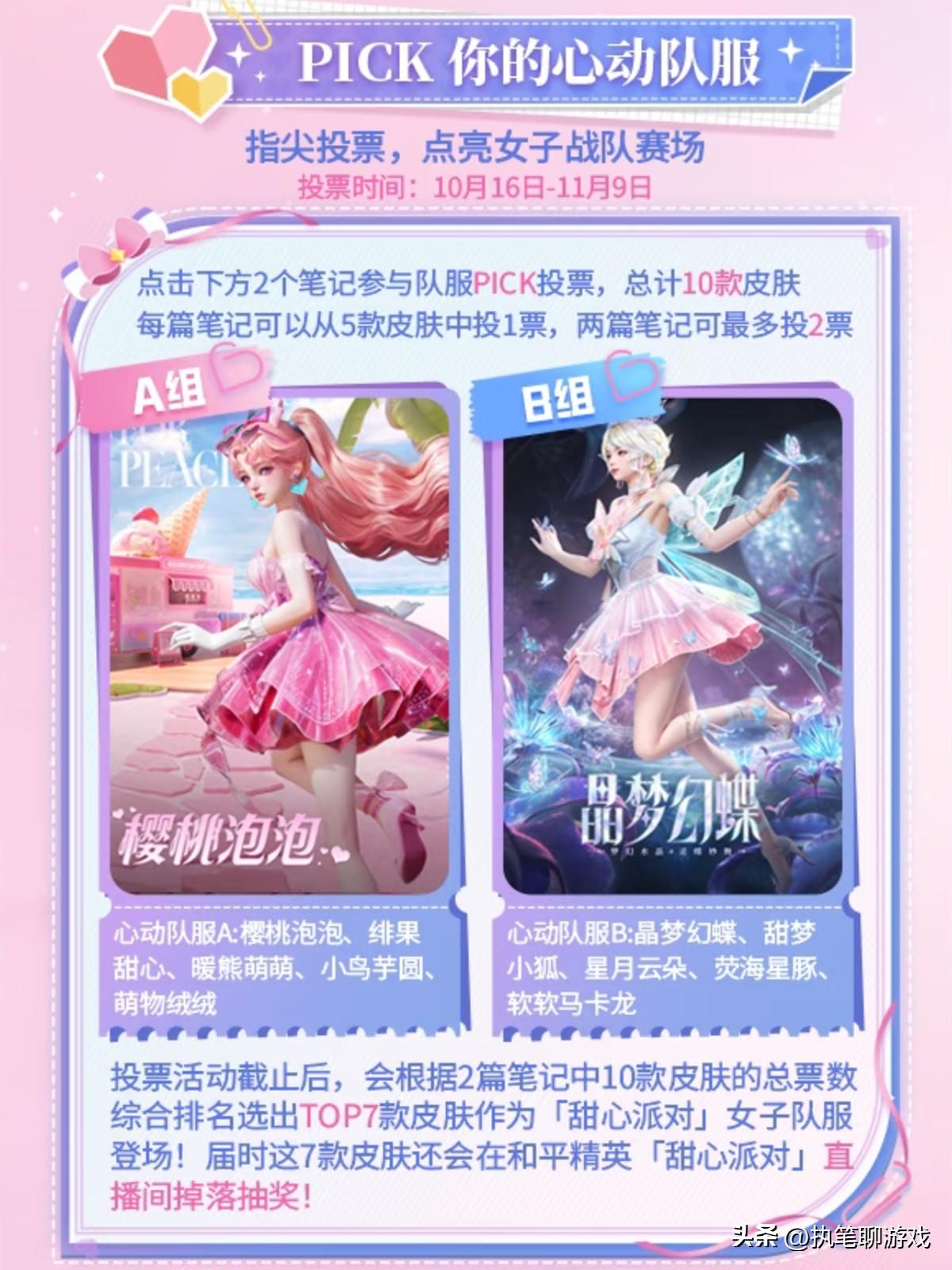 爲了迎接《和平精英》首屆女子競技秀場的到來,光子不僅帶來了任務積分抽獎的福利獎勵,而且還悄悄開啓了一個人氣票選,並且採用A組與B組的方式,不僅有轉盤而且還有套裝,最終來一個“10選7”,通過人氣票選的方式選出Top7作爲“甜心派對”女子隊服來登場。