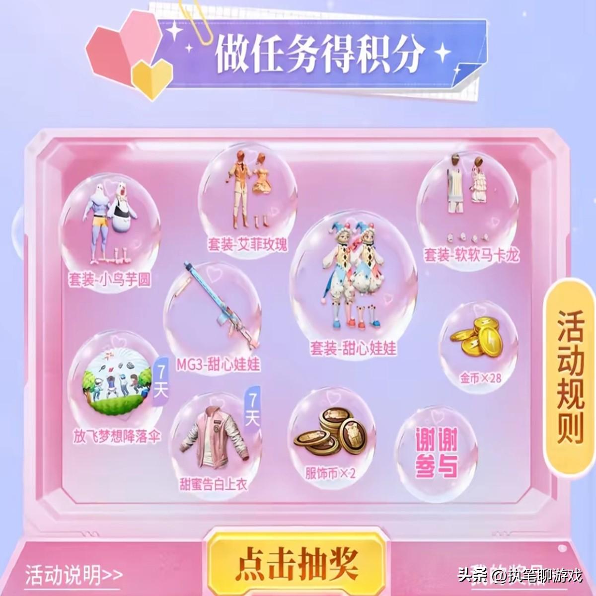 如圖所示,通過任務來獲得積分,然後就可以挑戰抽獎,光子拿出來的獎勵有甜心娃娃(套裝、MG3)、小鳥芋圓、艾菲玫瑰、軟軟馬卡龍等。