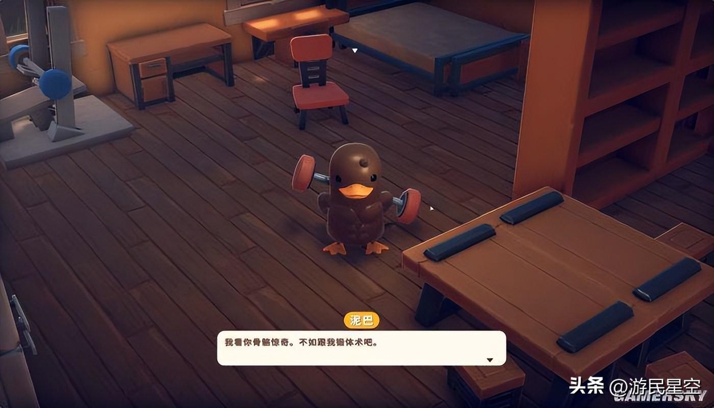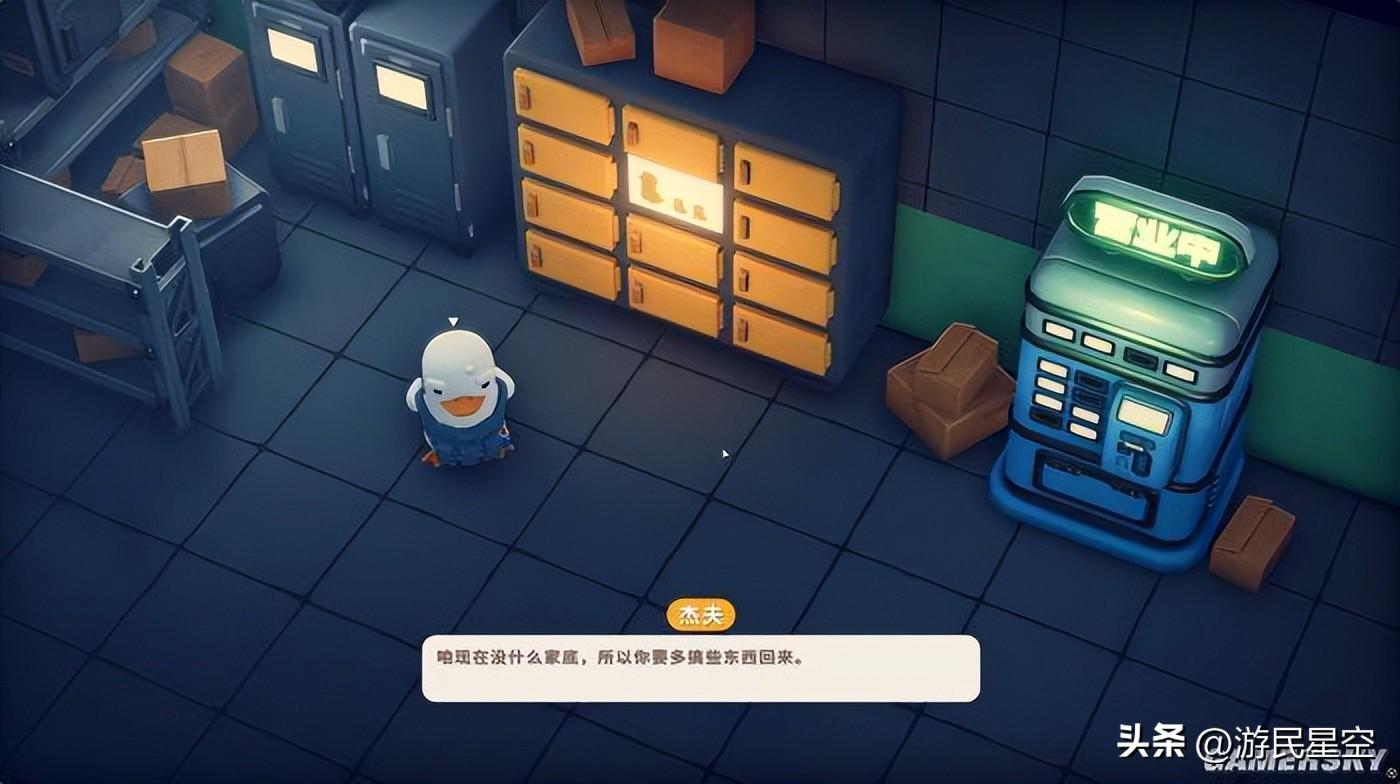 是的,《逃離鴨科夫》更像是一款標準的任務驅動遊戲,以至於在很多時候我都產生了自己是不是在玩一款角色扮演遊戲的錯覺。遊戲有着極其明確的主線流程——玩家所扮演的鴨子從奇異夢境醒來後,便發現自己處於一個名爲“鴨科夫”的世界。而經過NPC的“話聊”後,便得知了最終目標是建造飛船和小夥伴們逃離“鴨科夫星球”。