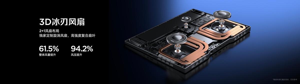 紅魔遊戲本16 PRO升級魔冷散熱架構2.0,從導熱、散熱多維度優化,確保高負載下機身不發燙、性能不降頻。採用3D冰封複合式熱管2.0,搭載4+2矩陣式排布的超寬高效熱管+獨家定製方形銅管,相比傳統熱管接觸面積提升10%,導熱效率提升30%,能將核心熱量快速散出。配備超大 VC 均熱板與超低熱阻相變材料,均熱能力強且輕薄省空間,持續性能提升 40%。另外還採用了2+1風扇佈局的3D冰刃風扇,獨家定製旋渦風扇與高強度複合扇葉,風壓提升94.2%,整體風量提升61.5%,能快速將散熱鰭片上的熱量排出機身,避免熱量堆積。