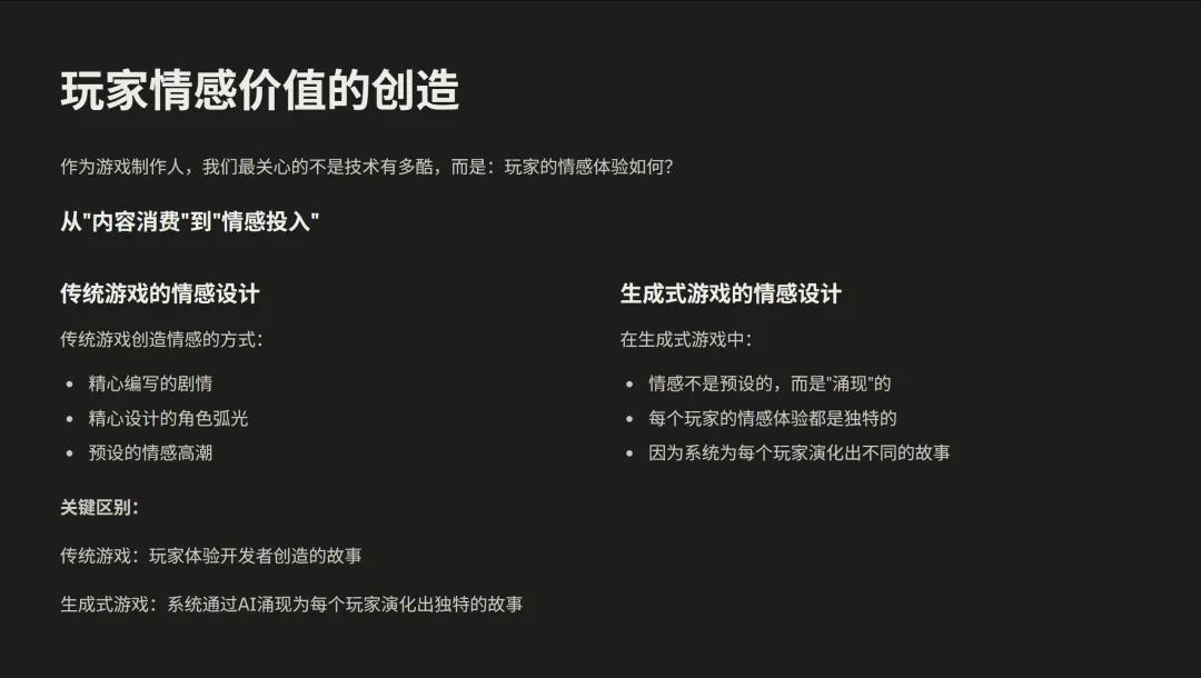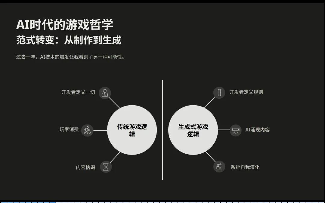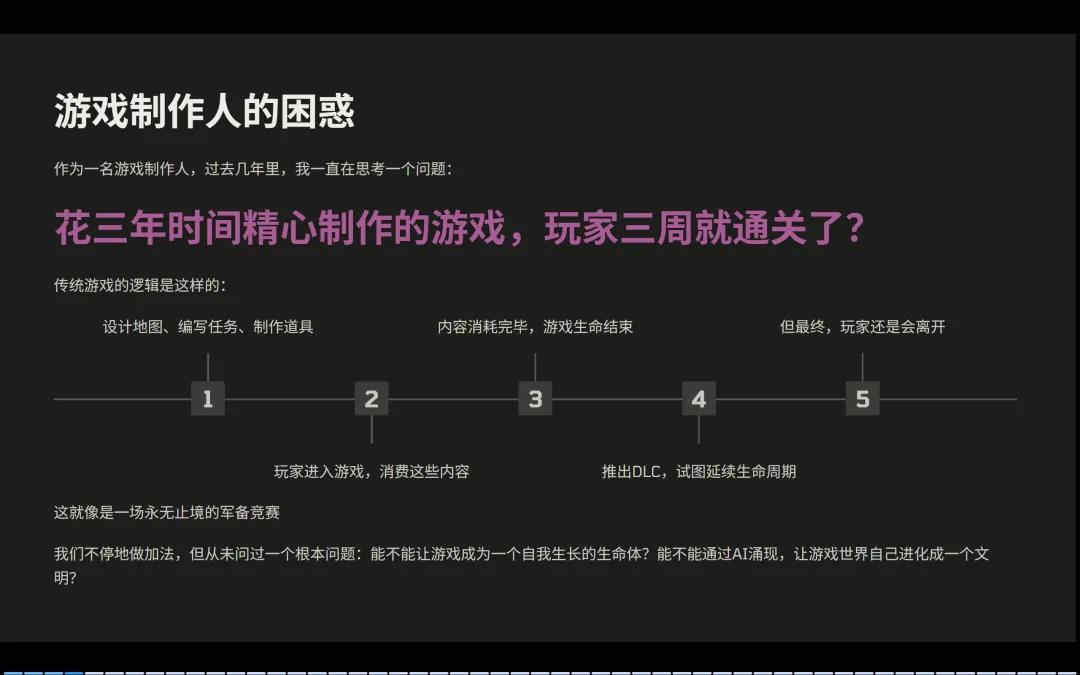 過去兩年裏, AI 爆發讓我們看到另一種可能性,傳統遊戲邏輯是,開發者決定一切內容給玩家消費,隨後這個內容就枯竭了,遊戲從而走向死亡。