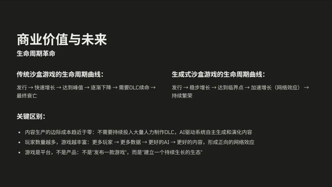 從商業價值來看,我們認爲這代表的是一種全新的生命週期模式。傳統遊戲的生命週期是:發行→快速增長→達到峯值→逐漸下滑→進入衰退。而生成式沙盒遊戲在發行和增長之後,會在達到臨界點時形成一個自我演化的生態,進而形成持續繁榮的能力。