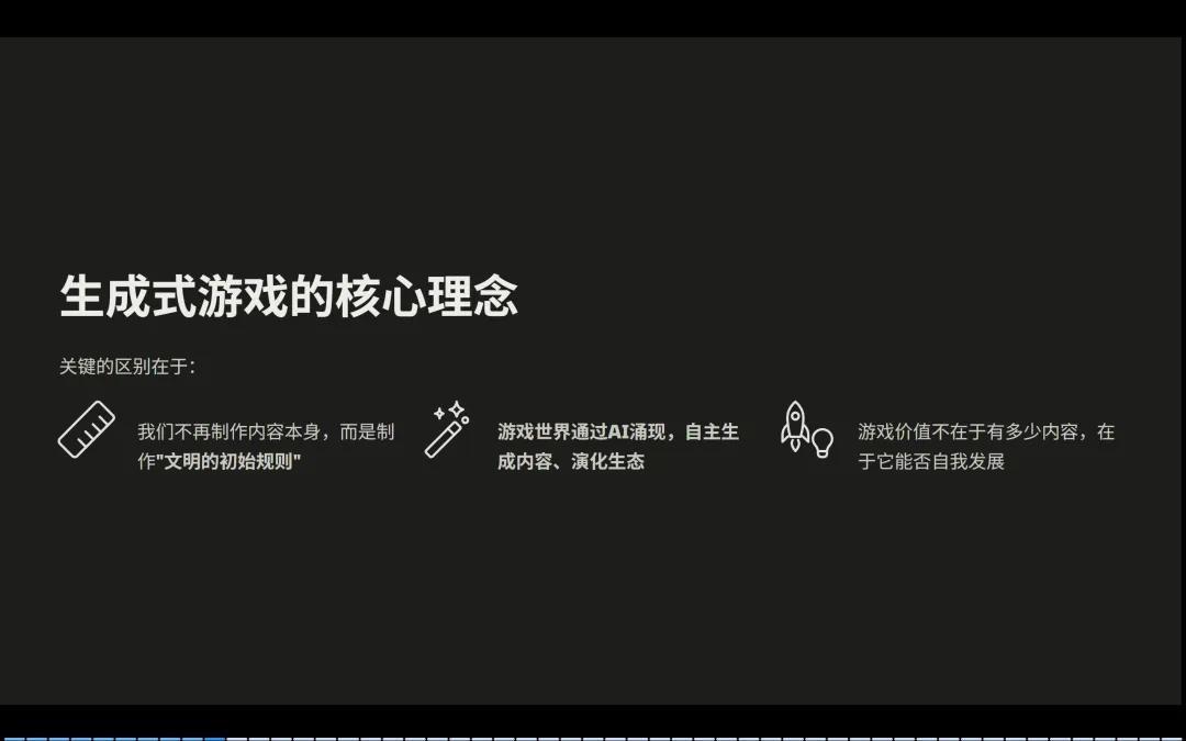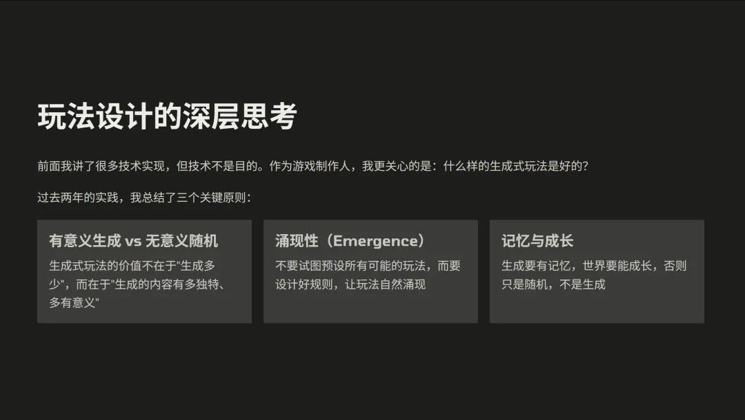 此外,張昊陽分享了從生成、探索、反饋到再生成的核心循環,以及“底座型遊戲”和“黃金三角”設計哲學。它們不僅會改變玩家體驗,也可能重塑整個遊戲產業的生產方式。