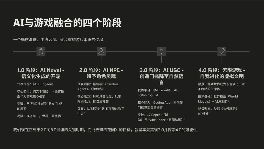 3.0階段,我們認爲是AI UGC 時代。在這個階段當中,Coding Agent 將創作的門檻降低到自然語言,玩家直接能夠進行遊戲內容的創作。這極大地鼓勵了玩家創作,並提升了內容質量,也縮短了製作遊戲內容的週期。像《Minecraft》和《Roblox》這樣的產品,其實在他們的遊戲社區中已經有人率先嚐試跟 AI 去結合。