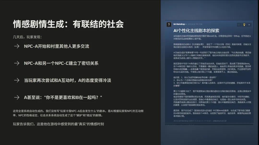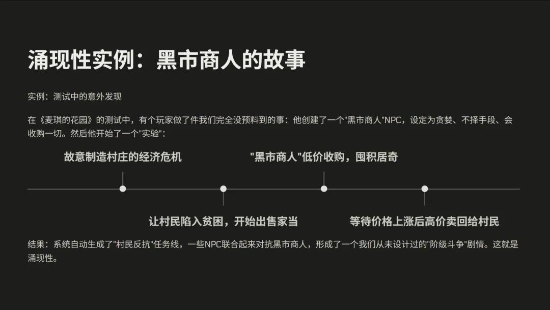 結果,系統生成的一部分村民開始反抗。一些 NPC 自發聯合起來對抗黑市商人,最終形成了一個我們從來沒有設計過的階級鬥爭劇情。這就是我們所說的“湧現性”。