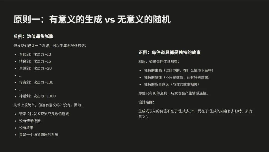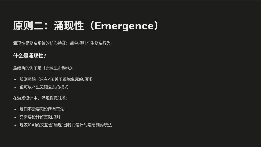 第二,湧現性。我們不去假設所有可能的玩法,而是設計規則,讓 AI 和玩家在對抗中自然湧現新的內容。