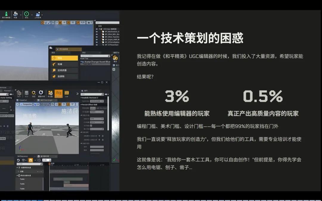 我記得在做《和平精英》的遊戲編輯器的時候,我們投入了大量的遊戲資源,希望玩家能夠利用這些資源去創造內容。結果我們發現,真正能熟練使用編輯器的玩家不到 3%,而真正產出高質量內容的不到 0.5%。