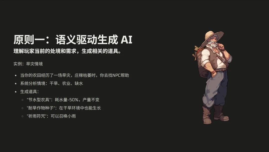 舉個例子,在遊戲當中可能會出現一個旱災的劇情。農田經歷了一場旱災,莊稼枯萎的時候,系統可以識別到你可能需要一些幫助。它也會識別到當前的情境是旱災,農業缺水,生成的道具可能就會是節水型的道具,給你耗水量減 50%,但是你的產量不變。第二種就是耐旱的作物種子,比如說乾旱的環境當中也能生長。第三種可能就像這種祈雨儀式的材料。