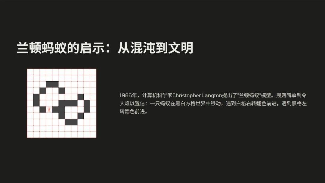 1986 年,科學家蘭頓提出了一個極簡模型,簡單到難以置信。想象一個無限大的黑白格子世界,只有一隻螞蟻在上面移動,它的規則只有兩條:如果螞蟻站在白色格子上,就把格子翻成黑的、右轉並前進;如果站在黑色格子上,就翻成白的、左轉並前進。不斷重複,就這麼簡單。