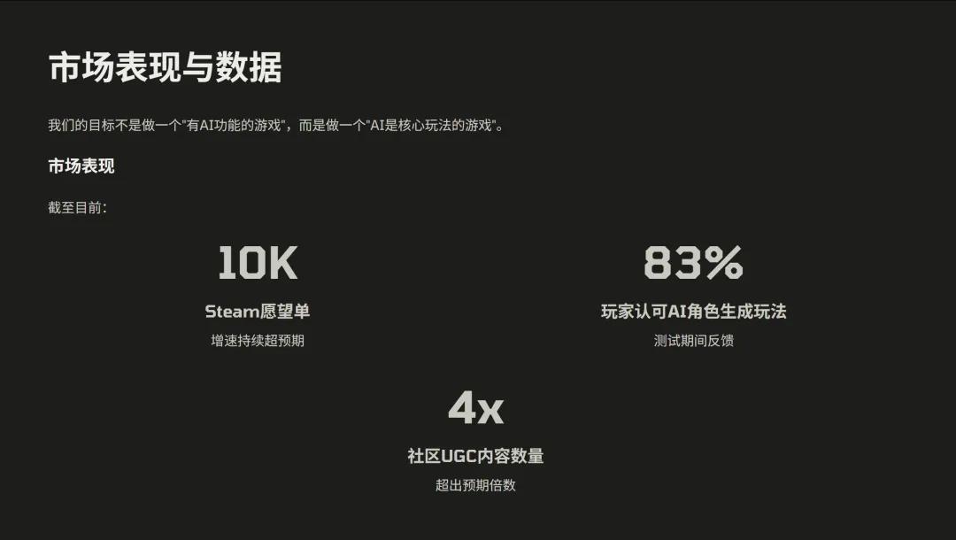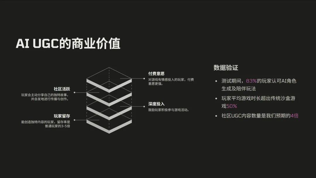 從數據的驗證來看,我們有 83% 的玩家認可 AI 陪伴的一些玩法,玩家平均遊玩時長超過傳統的沙盒遊戲 50%,社區 UGC 內容是我們當時預期的 4 倍左右。