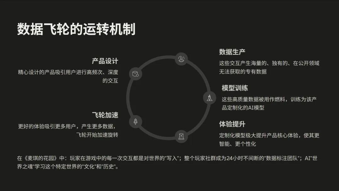 而AI到來的時代,我們稱之爲“數據爲王”時代。當傳統人力驅動的生產關係,已經沒有辦法去滿足海量的內容和個性化需求的時候,我們認爲需要一場範式革命來改變生產關係。真正的壁壘,不再是我們開發的代碼和內容,而是數據飛輪。