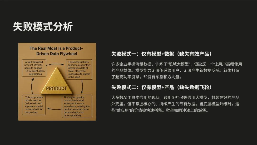 有一些 AI 創業公司做所謂的私域大模型的產品,但缺乏一個用戶高頻使用的產品載體,模型能力無法真正傳遞給用戶,也無法產生新的數據,就像造了一個高功率的引擎,卻沒有車身,永遠在空轉。