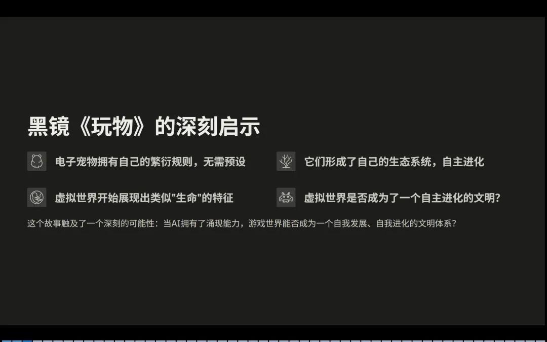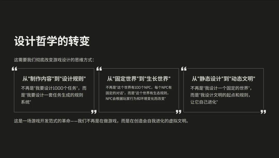 同樣地,我們或許不是在做 AI 遊戲,而是在孕育一個新的文明。這個文明會在規則中生長出我們預料之外的複雜性,它永遠不會“完成”,因爲它永遠在生長。