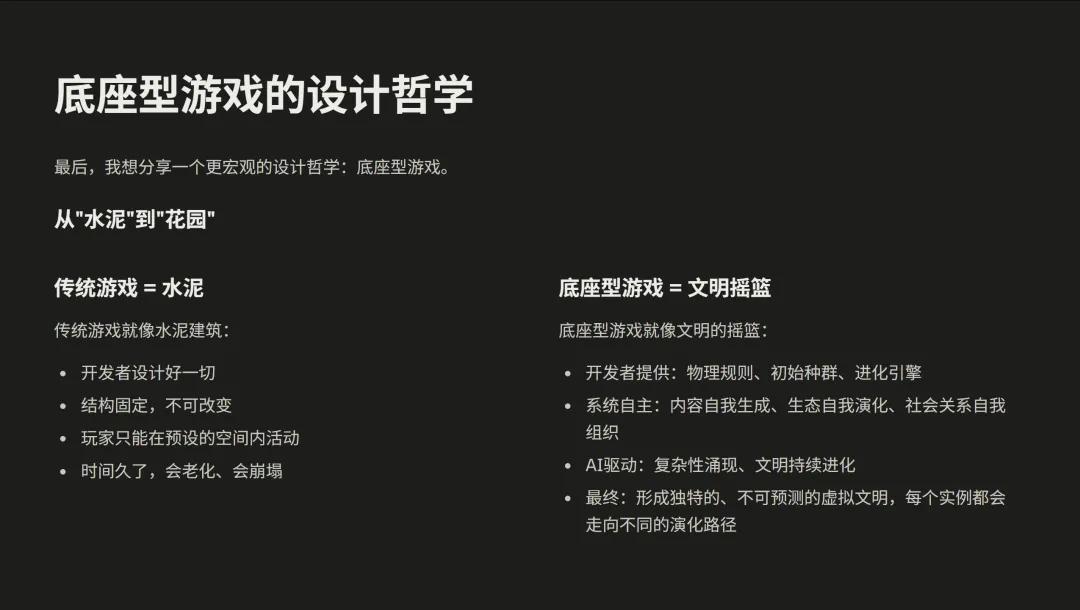 而底座型遊戲更像是一個搖籃,開發者提供的是基礎的物理規則、初始的種羣和進化的方法,系統可以自主生成內容,自主發展生態文化,自主形成社會關係。