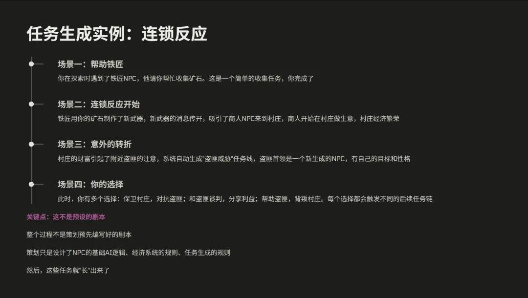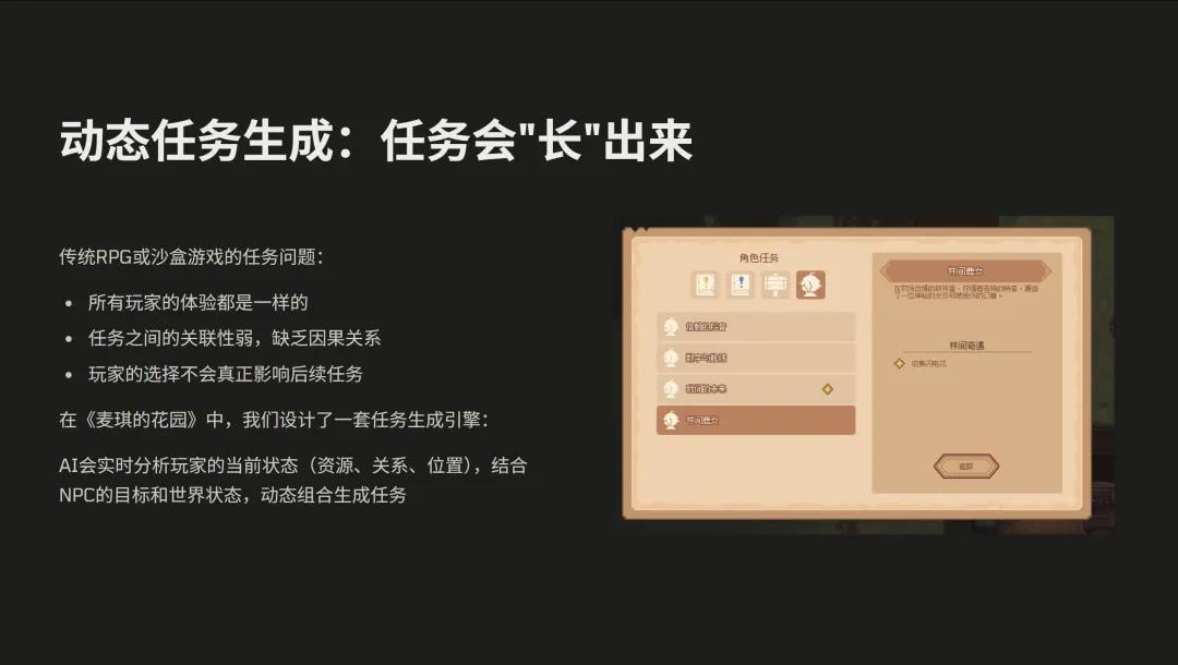 但我們認爲,生成式的任務是不一樣的。在我們的遊戲當中,我們設計了一套任務生成的系統,AI 會實時分析玩家的狀態,包括他的資源,他的社會關係,還有他的位置,結合他的目標和世界的當前的狀態,動態地生成任務。