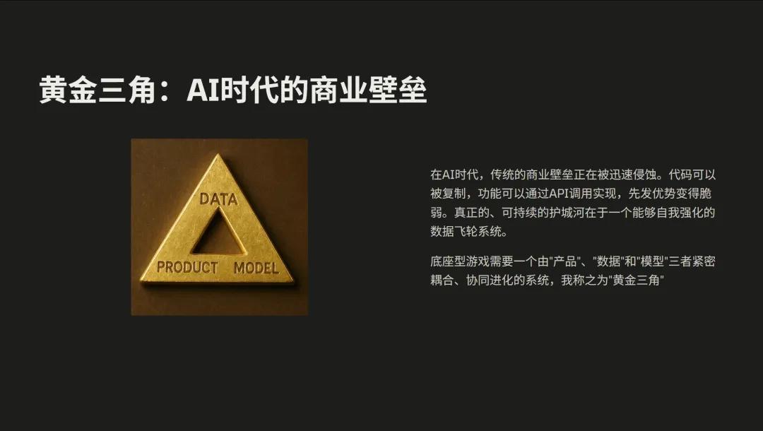 這樣的突破性遊戲需要產品、數據和模型三者緊密結合,形成一個協同進化的系統,我稱之爲“黃金三角”。我認爲它不僅適用於遊戲,對所有 AI 產品也都成立。