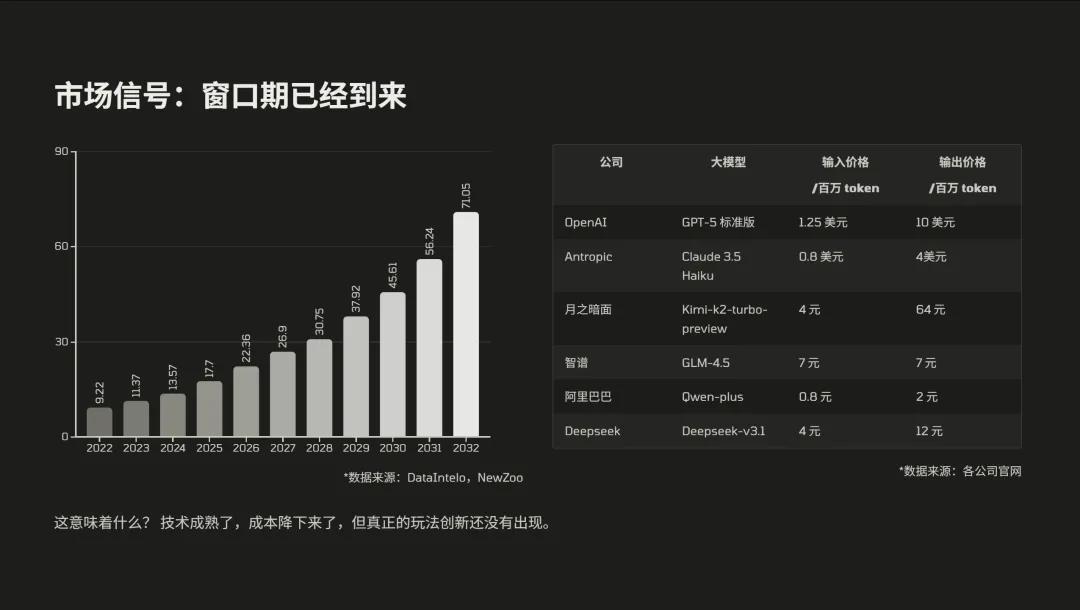 全球的 AI 遊戲市場,預計從 2023 年到 2032 年,複合增長率將達到 23.3%,而同時大模型的 Token 價格在過去的兩年內下降了 90% 以上,但是目前大多數遊戲廠商它其實還停留在 AI NPC 的聊天的階段,這意味着什麼?