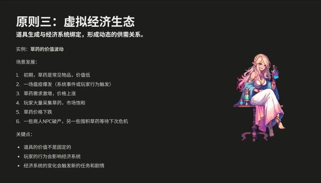 我們有三個原則。第一個是語義驅動生成,第二個是屬性要跟敘事相關,第三個是它要產生一個虛擬的經濟生態。