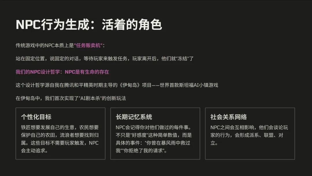 其次,是從固定世界到生長世界。不再是這個世界擁有 100 個 NPC,每個 NPC 有固定的對話,而是這個世界它有一個生產規則,NPC 會根據玩家行爲和環境去改變。