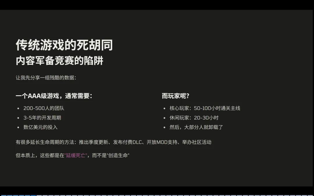 我認爲這時候遊戲也面臨三大不可持續的危機:第一個危機是經濟的危機,3A 成本太高,高達兩三億美元,週期很長,可能是 5~7 年開發時間。