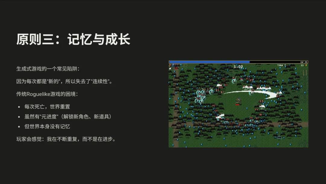 接下來的原則是“記憶和成長”。肉鴿遊戲的一個常見陷阱在於:每次重開都是新局,缺乏延續性。很多遊戲中,玩家死亡後世界歸零,雖然每次可能都有進步,但世界本身是靜止的。久而久之,玩家會感覺自己只是在不斷重複,而不是在真正成長,最終會覺得無聊。