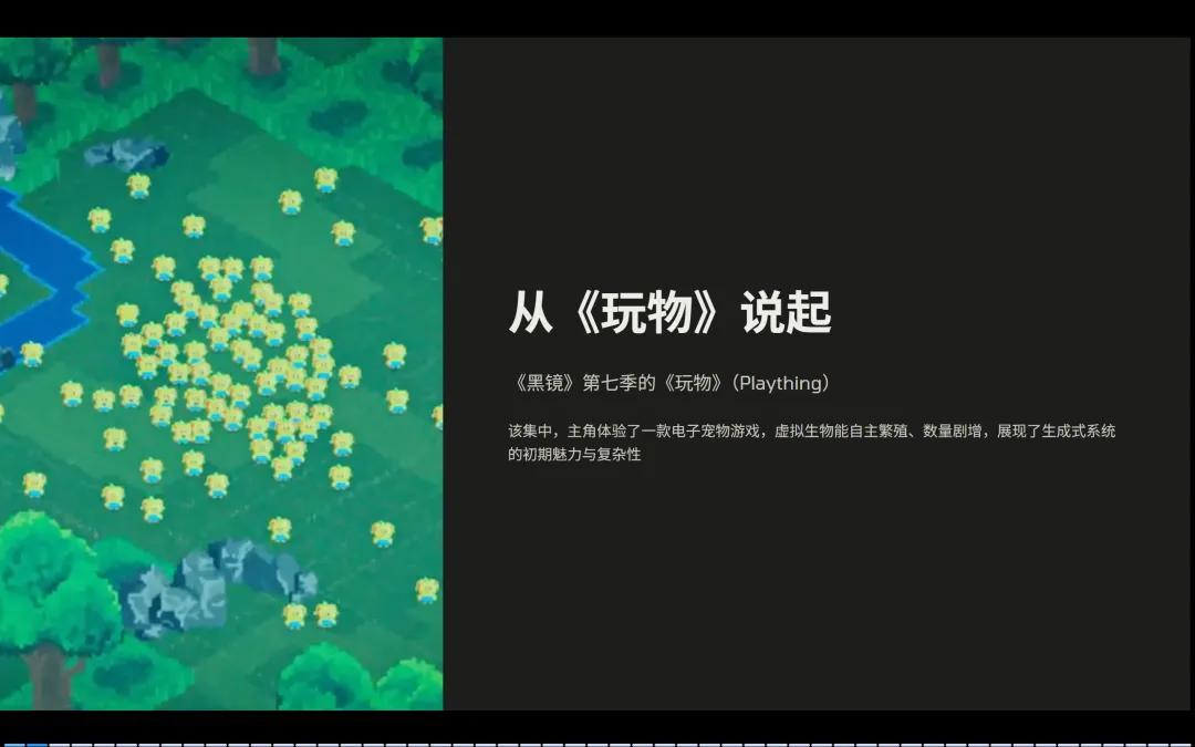 分享一開場,張昊陽就拋出了一個問題:你有沒有想過,虛擬世界裏,遊戲裏的生物能否自主進化?這並非科幻設想,而是他團隊正在嘗試實現的可能——讓遊戲不只是被設計好的內容,而是像一個文明一樣自我發展。