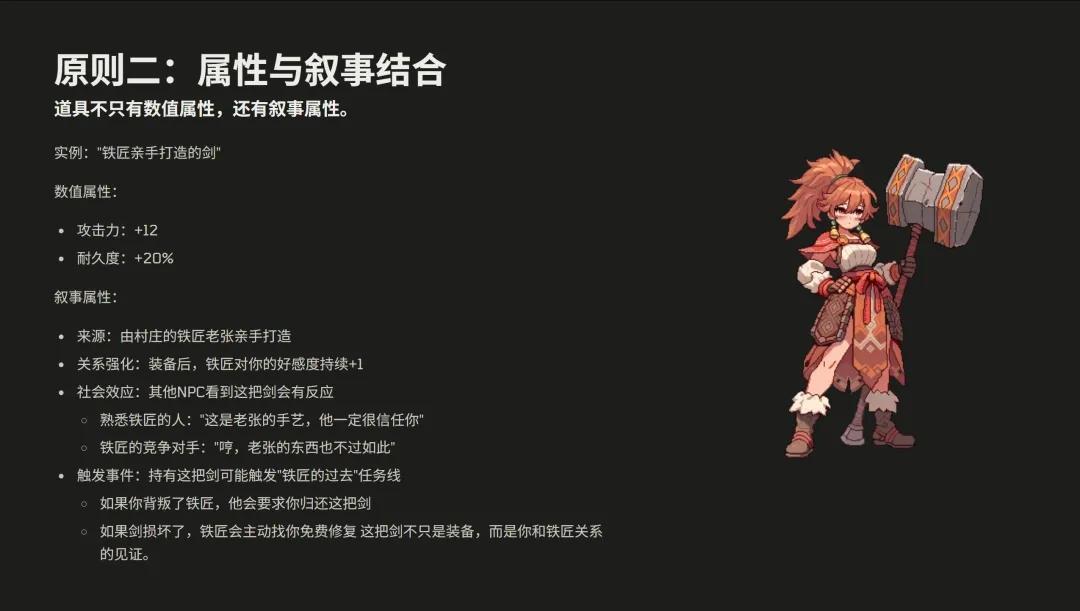 第二個原則,就是我們的屬性要跟敘事結合。比如說那把鐵匠親手打造的劍,數值屬性可能是攻擊力 +12,耐久度 +20%。而它的敘事屬性則是由村莊的鐵匠親手打造,在裝備之後,鐵匠的好感度會上升。