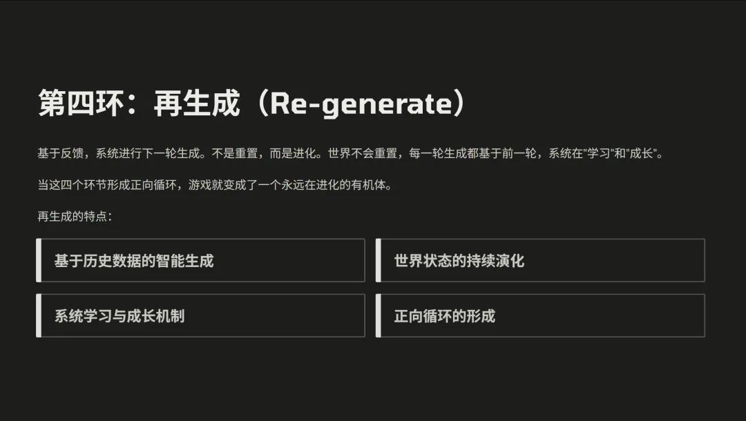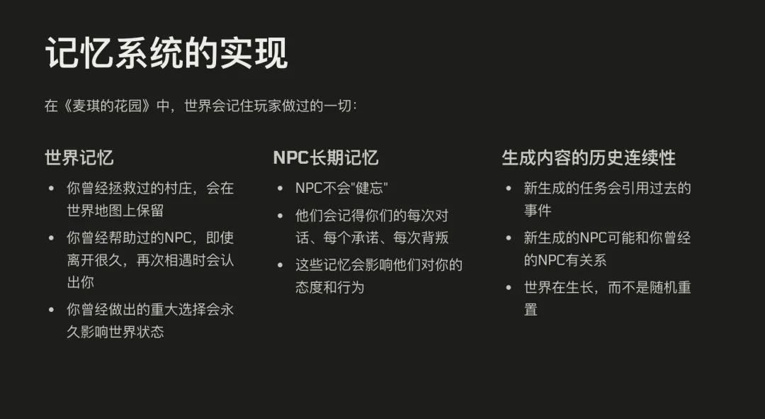 第三,“記憶和成長”。只要系統有記憶,世界就能成長;如果沒有記憶,那所有內容都只是隨機指令,不是真正的生成。