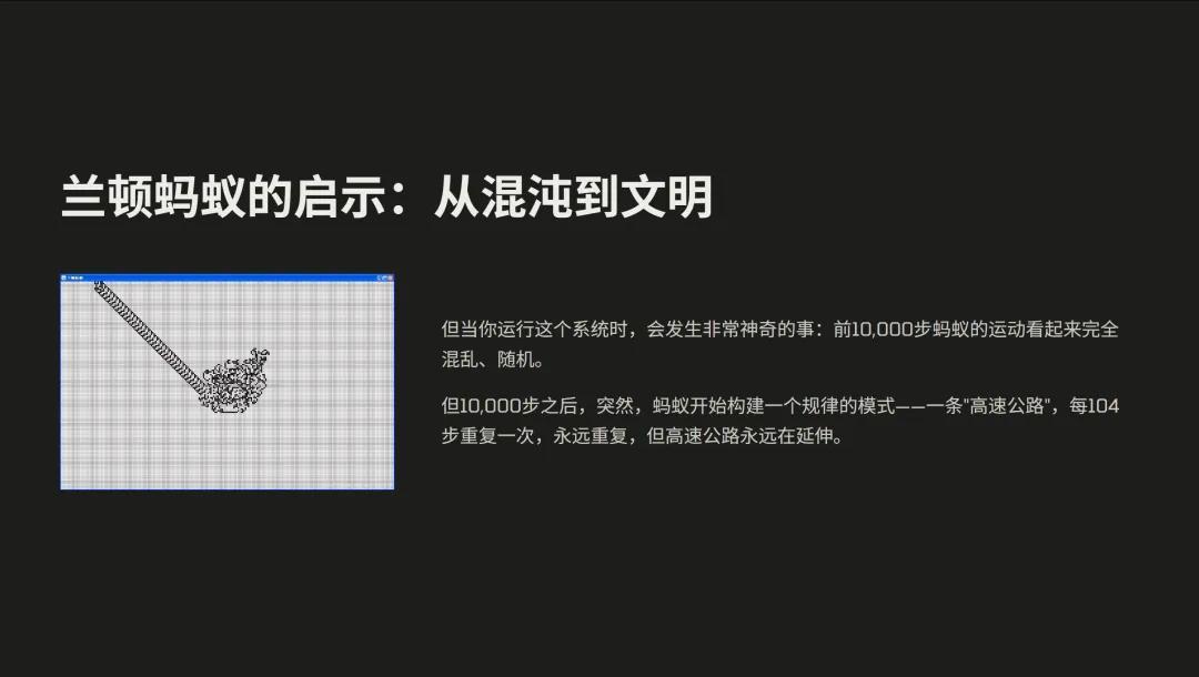 而且這條高速公路會以固定的節奏一直延伸下去,螞蟻每 104 步就重複一次動作,彷彿進入了某種秩序狀態。驚人之處在於:沒有人設計過這條高速公路,規則裏也沒有任何關於構建秩序的描述。