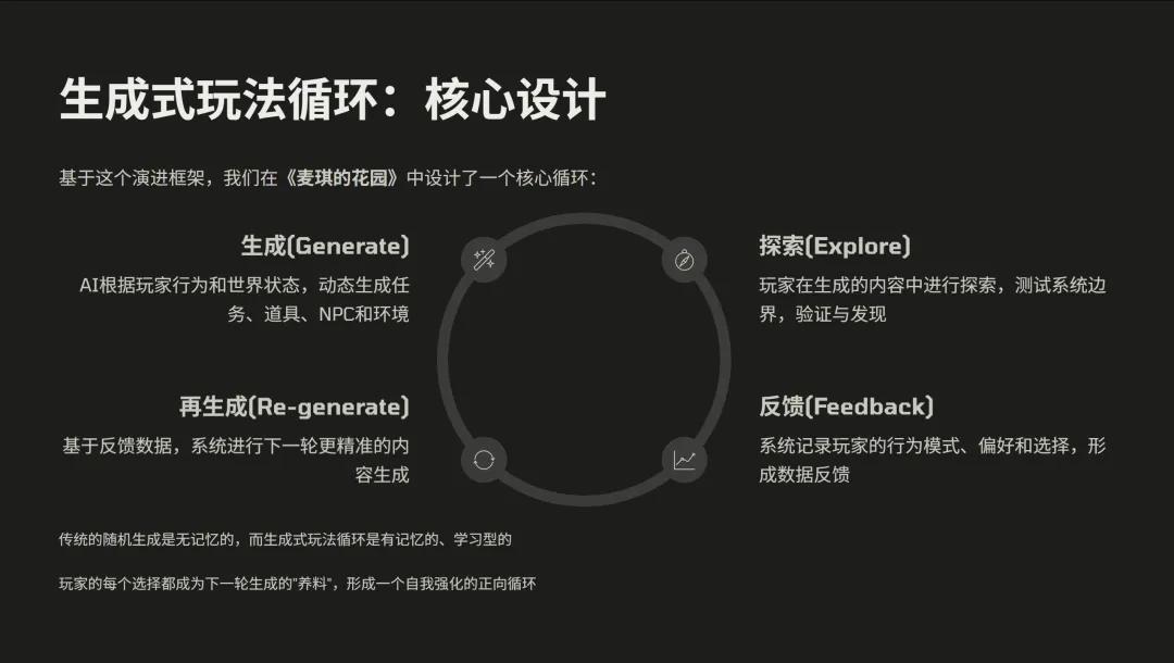 基於這樣的一個框架,我們做了一款產品叫《麥琪的花園》。我們所設計的一個核心循環,是“生成 → 探索 → 反饋 → 再生成”。