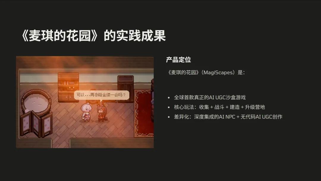 AutoGame開發的遊戲《麥琪的花園》,目前在Steam上有一萬人添加了願望單。此前的測試中,有 83% 的玩家認可 AI 陪伴的玩法,玩家平均遊玩時長超過傳統的沙盒遊戲 50%,社區 UGC 內容是他們當時預期的 4 倍左右。
